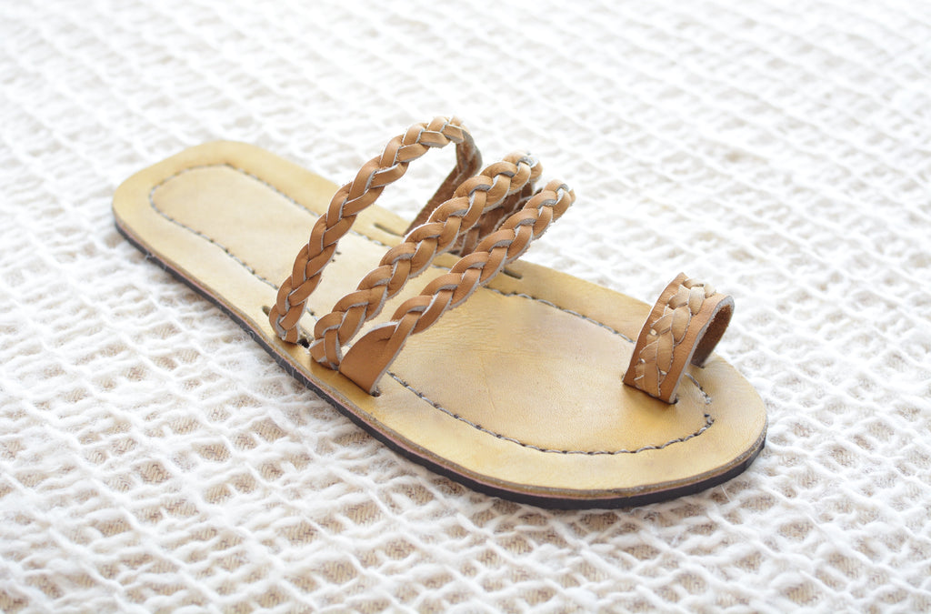 Handmade and dyed leather sandal with three braided straps, braid on toe strap and recycled tire sole. Leather colors may vary slightly and order a full size up if you're a half size, for example: if you're a 7.5, then order an 8.